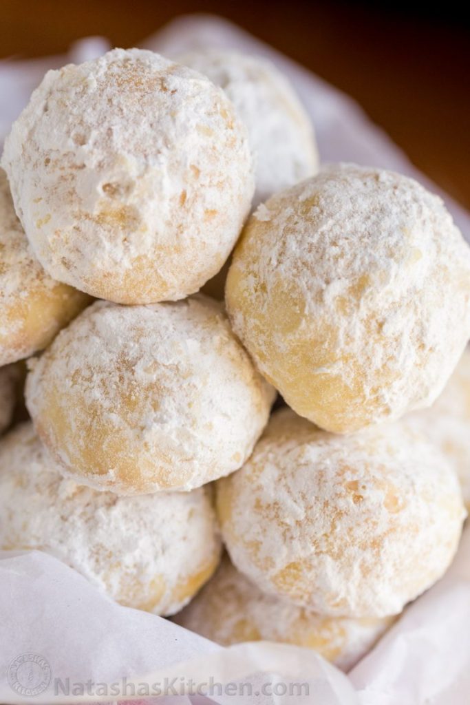 - Fill a bowl with 1 to 1 1/2 cups powdered sugar and while cookies are warm (not hot), roll them in powdered sugar then place on wire rack to cool completely before rolling them a second time in powdered sugar